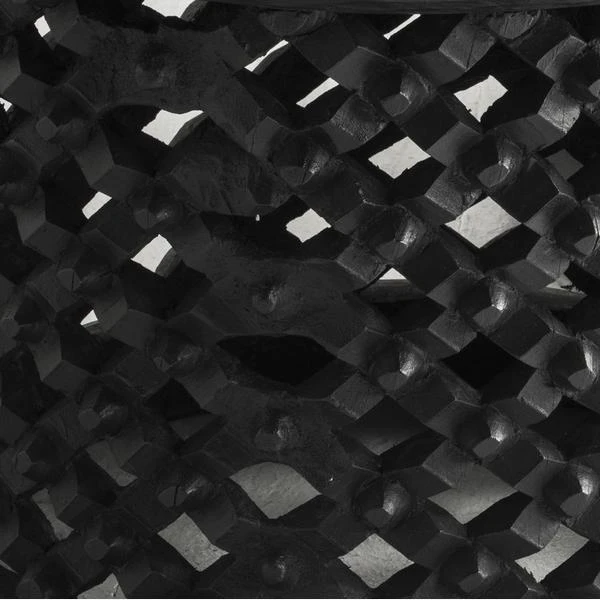 A circular black wooden stool, with a lattice design through the