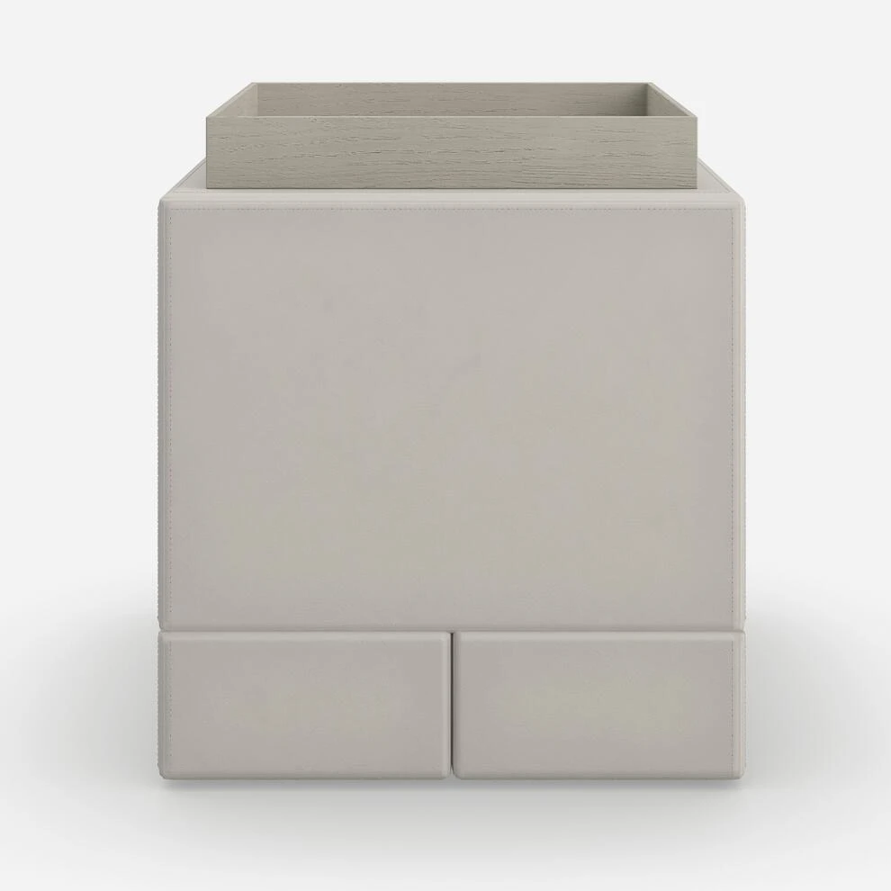 a luxurious taupe leather. Comes with its own elegant oak tray in a