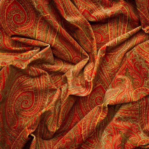 Featuring a bold paisley design in vibrant hues of orange, red