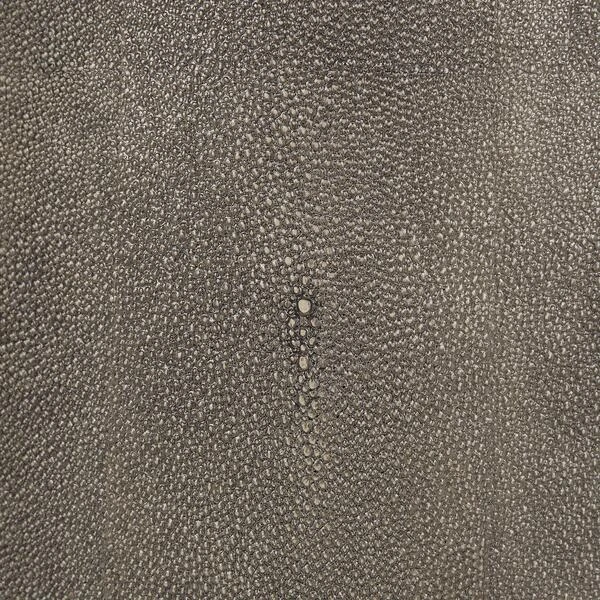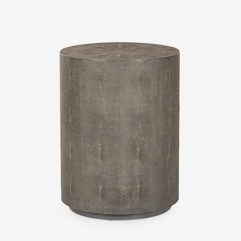 A cylindrical side table in all-over charcoal faux shagreen.