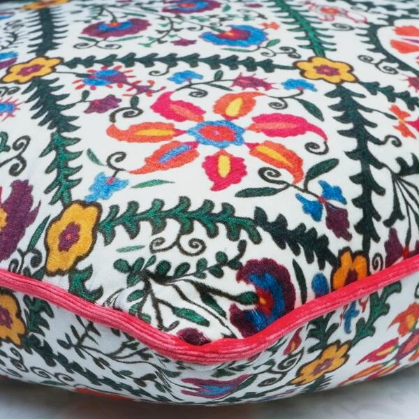 A plush velvet cushion featuring our fabric, a printed velvet vintage suzani design fabric