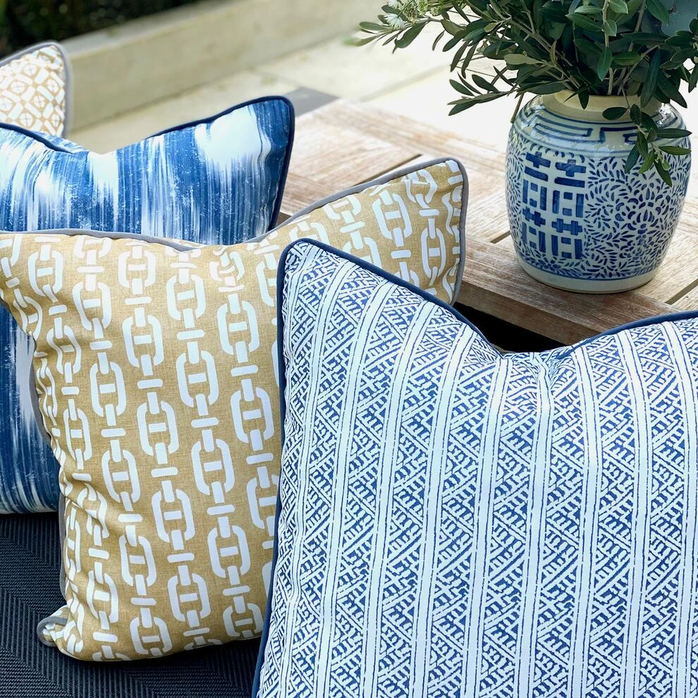 This outdoor cushion is printed on a polyester cloth with a
