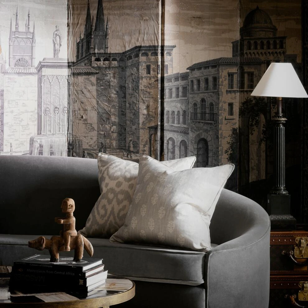 A luxurious cushion made from , a small Indian floral block print with a delicate