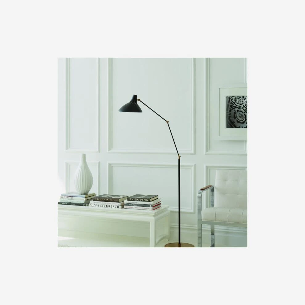 A sleek floor lamp in matte black with antique brass fixings.