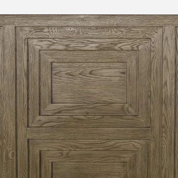 quartered oak, in a weathered taupe finish.