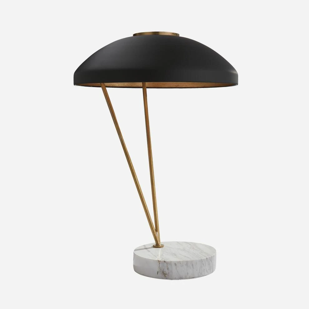 matt black shade elegantly contrasts with the burnished brass stand