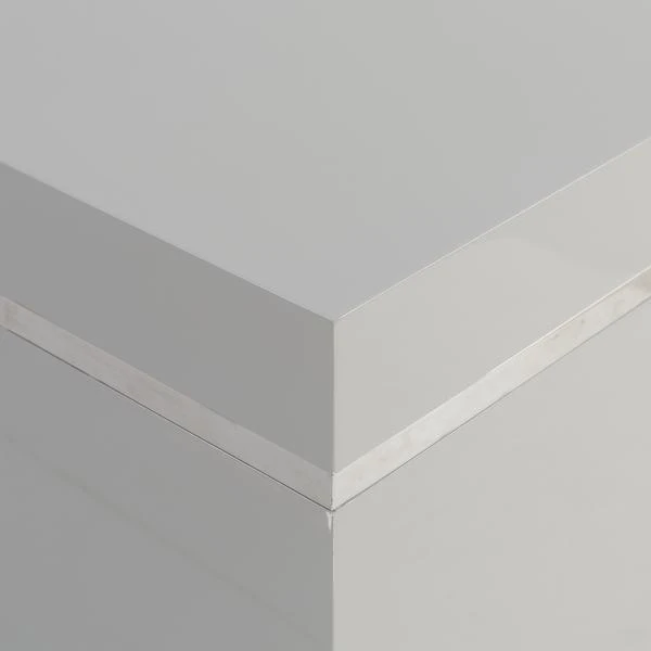 A soft putty coloured, glossy lacquered table with a stainless