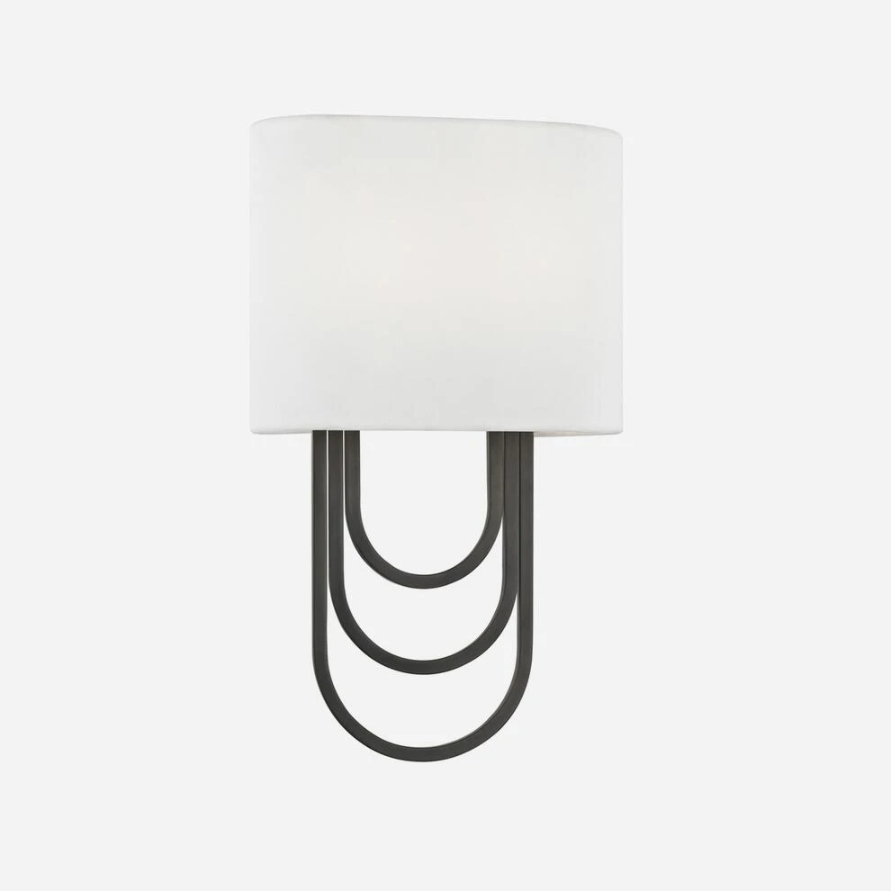 three looping arches in old bronze hang below a white linen shade.