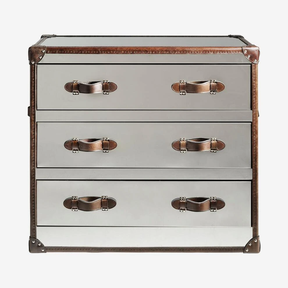 A mirrored steel chest with three large drawers, chrome rivet