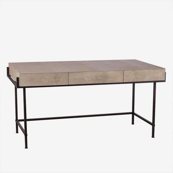 A faux shagreen top desk in cream on a slim, iron frame,