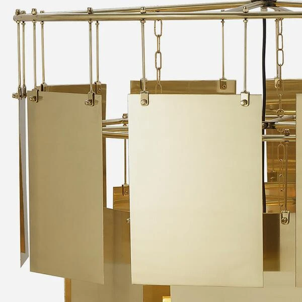 the traditional chandelier. Cascading sheets of brass reflect and
