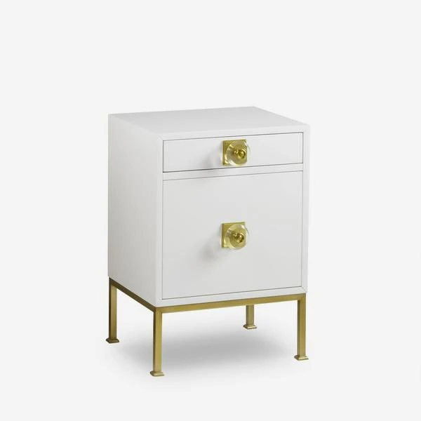 A 60s style bedside table set in smooth white lacquer with shiny