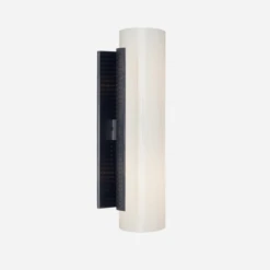 A contemporary wall light with a cylindrical white glass form