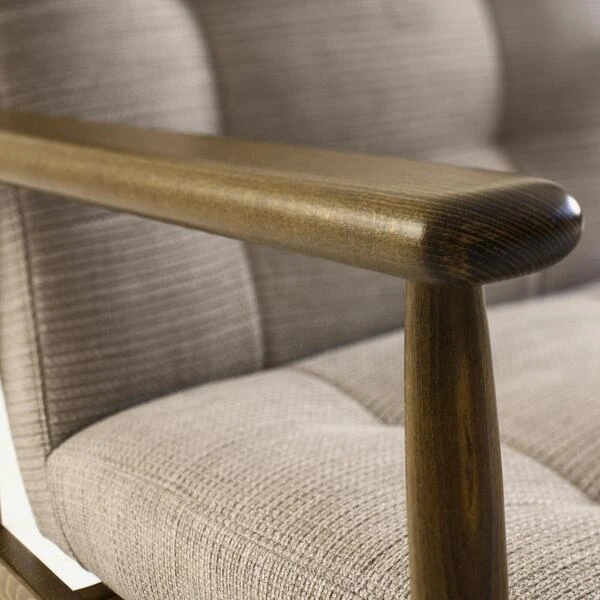 Mid-century wood frame armchair in a soft grey linen weave